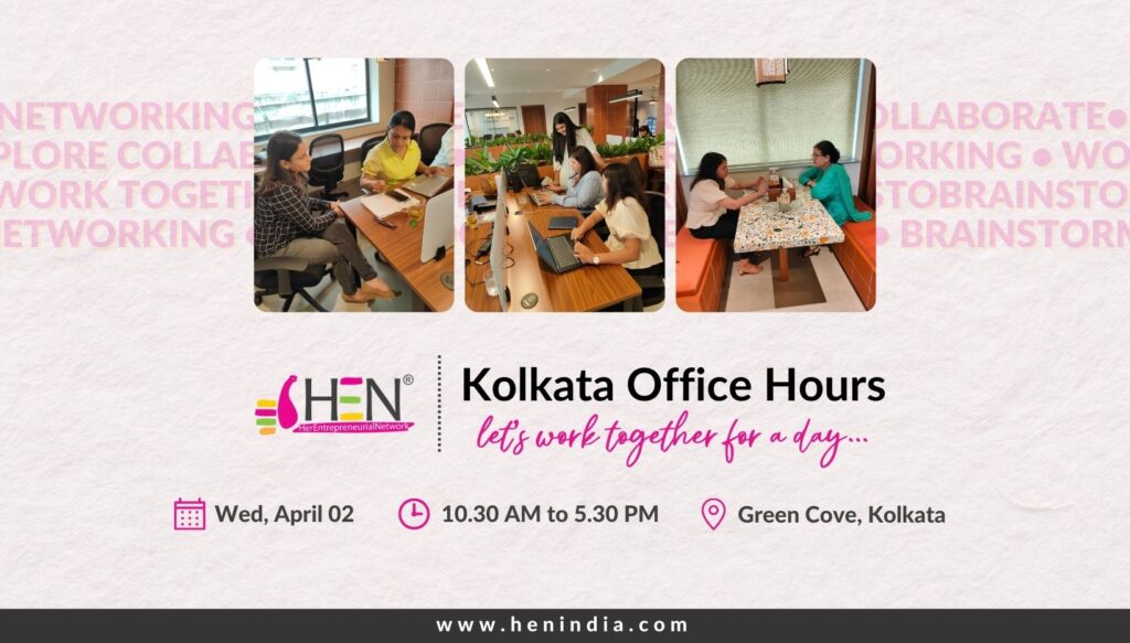Summary Escape the Ordinary & Elevate Your Hustle: HEN Office Hours! Calling Women Entrepreneurs in Kolkata! Ready to supercharge your workday with focused work, insightful connections, and collaborative energy?  Join us for HEN Office Hours! What awaits you: Fresh Workspace: Ditch the usual and work in a stimulating environment designed to spark productivity. Expand Your